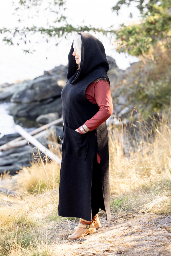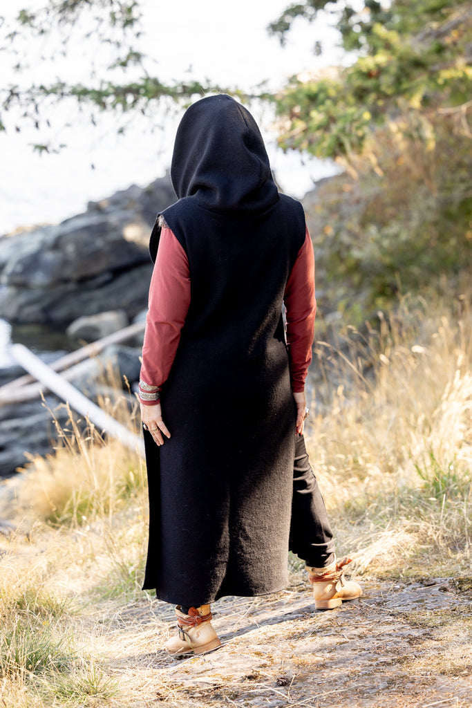 Truly the ultimate in cozy layers! This long merino wool vest is complete with a deep and delicious hood.