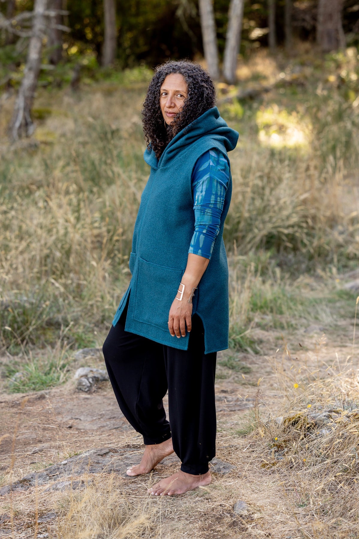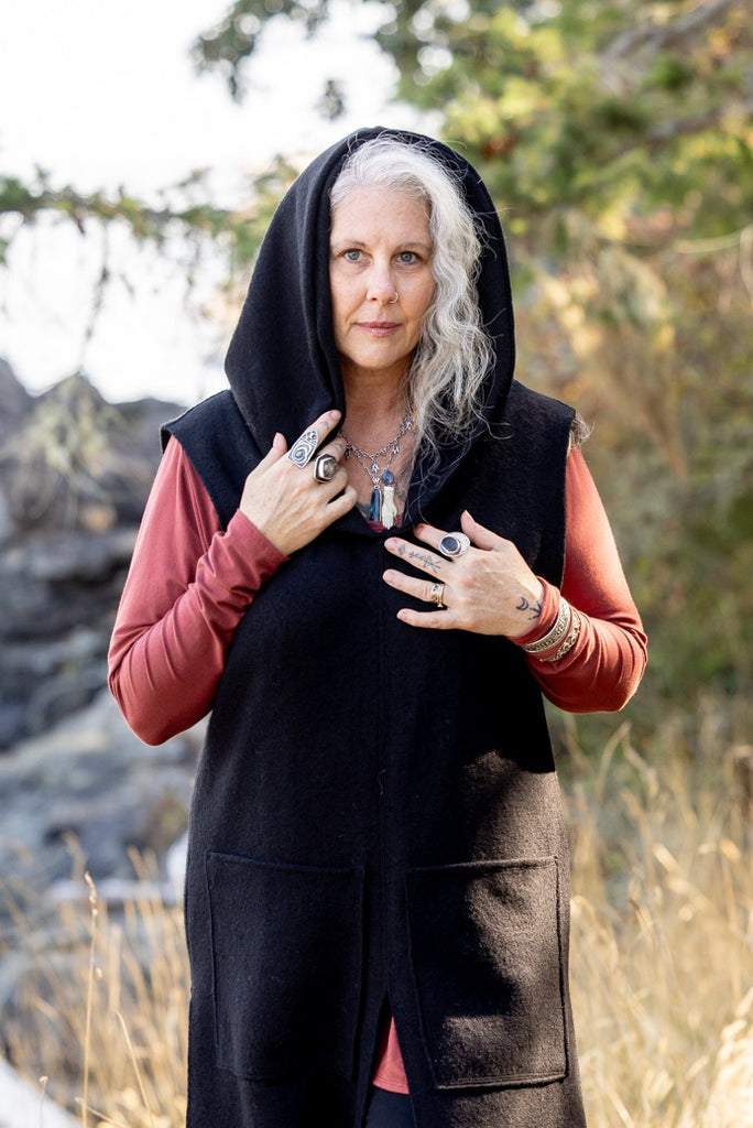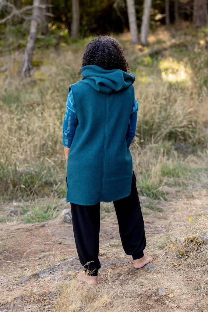 Truly the ultimate in cozy layers! Our short merino wool vest is complete with a deep and delicious hood.