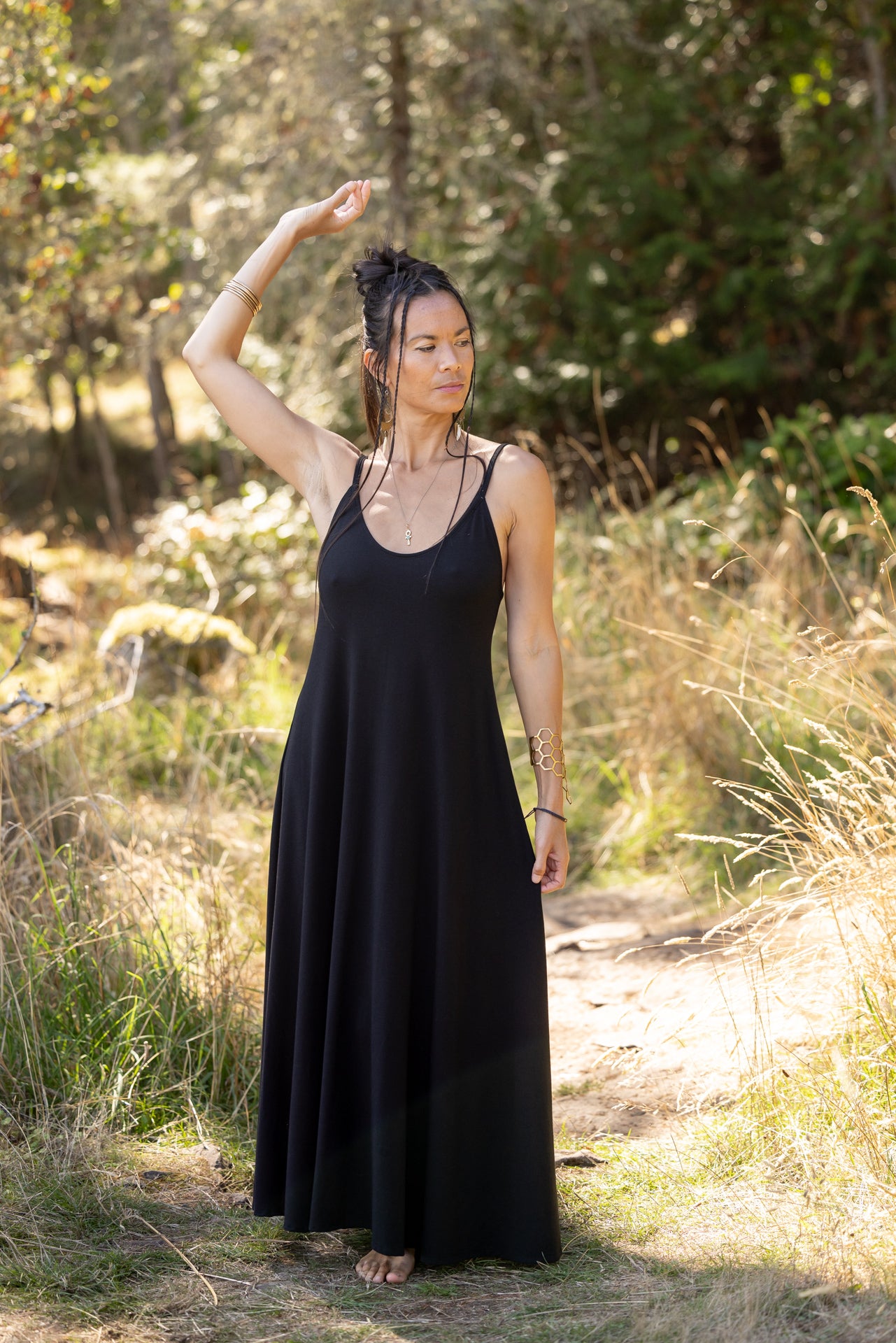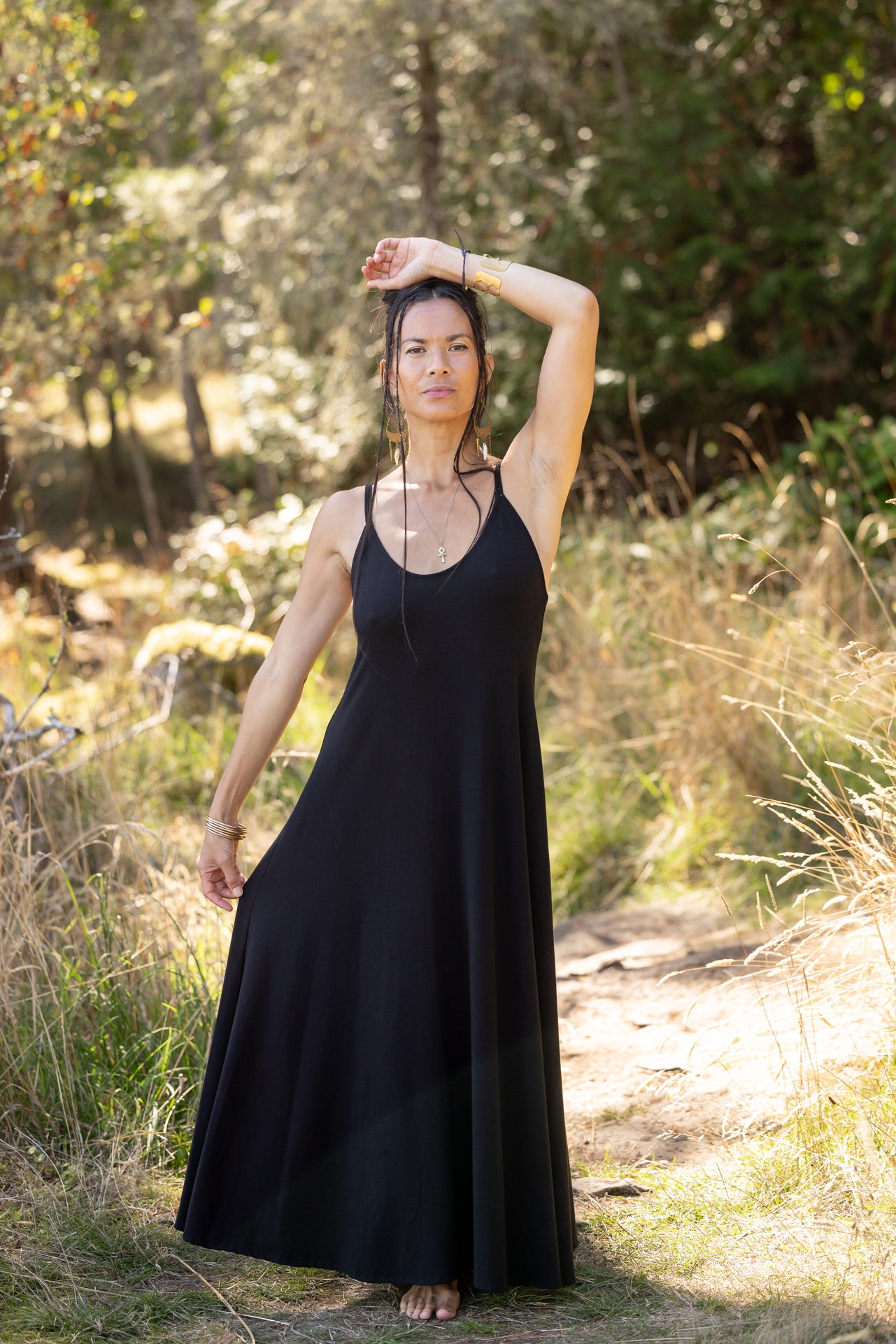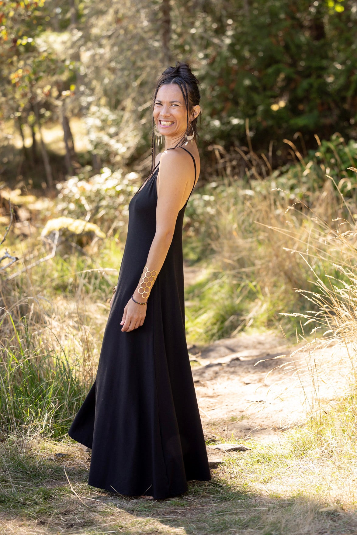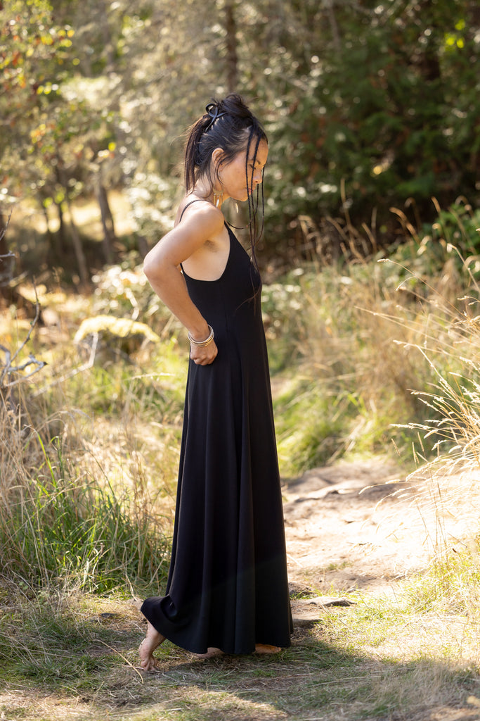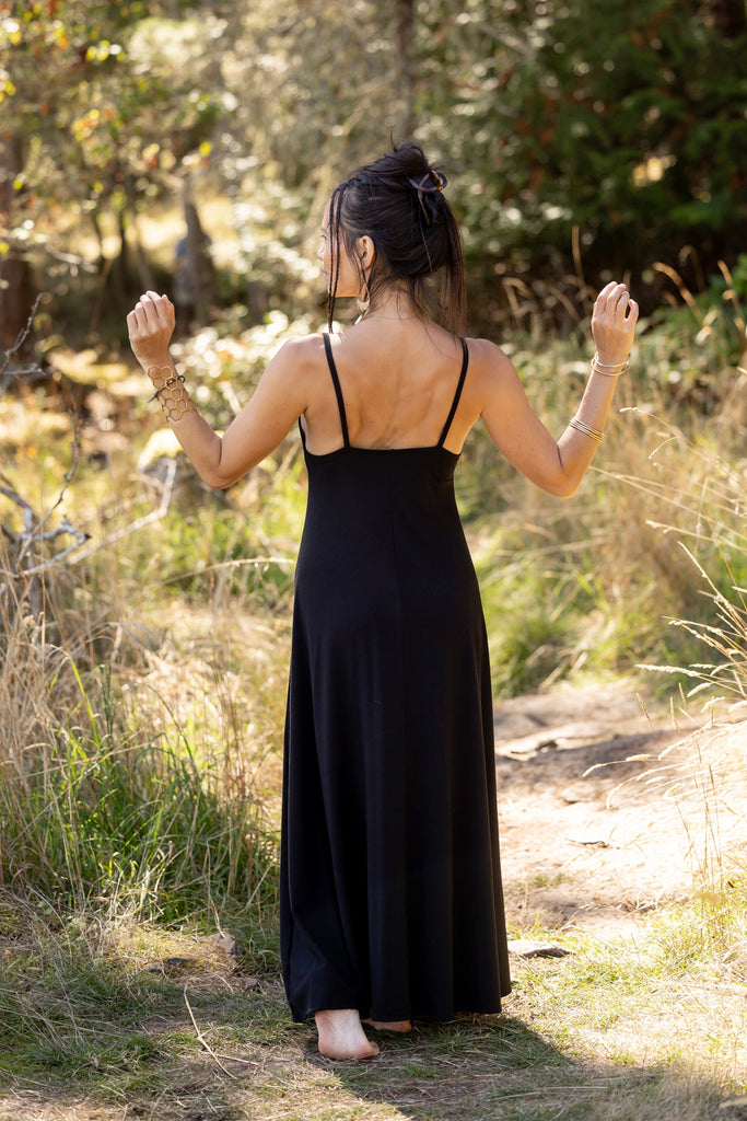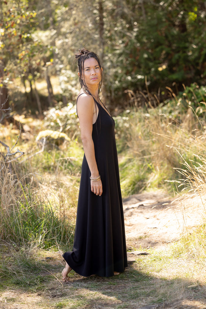 A gorgeous dress with a full flowing skirt. This piece is so flattering on so many women! Fitted at the top with the perfect flow from your bust to the bottom. It does not touch the ground as some maxi dresses do!