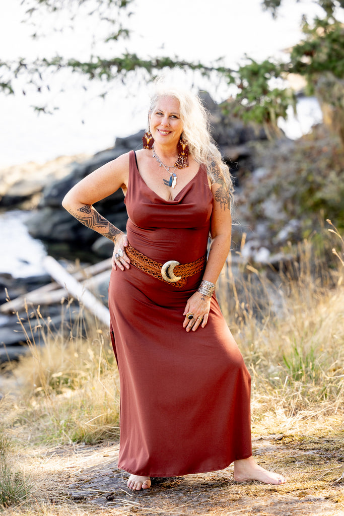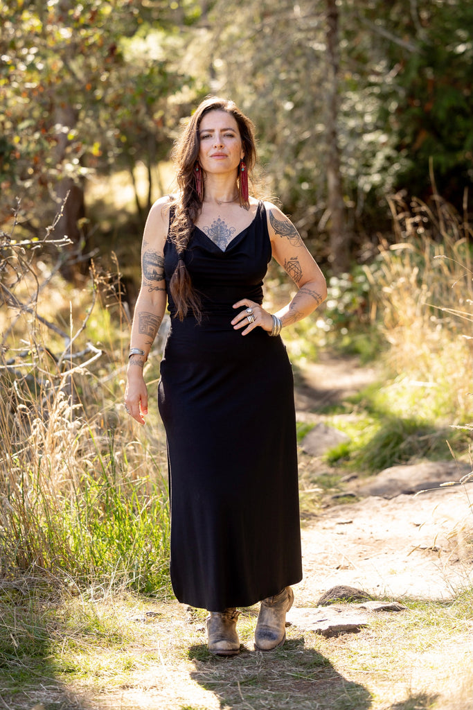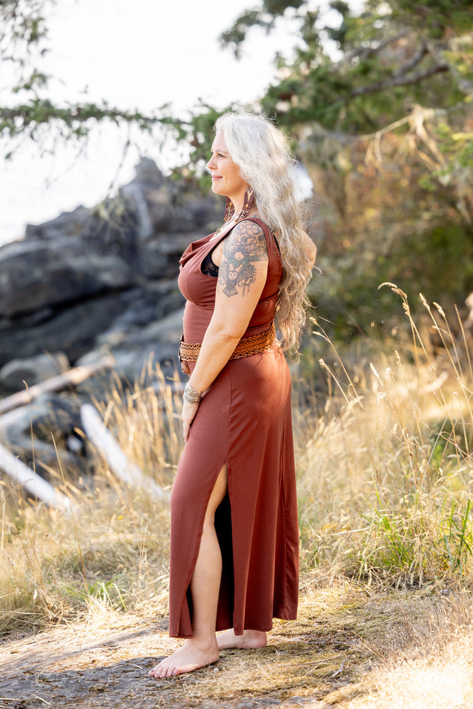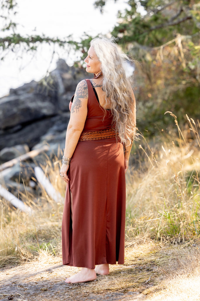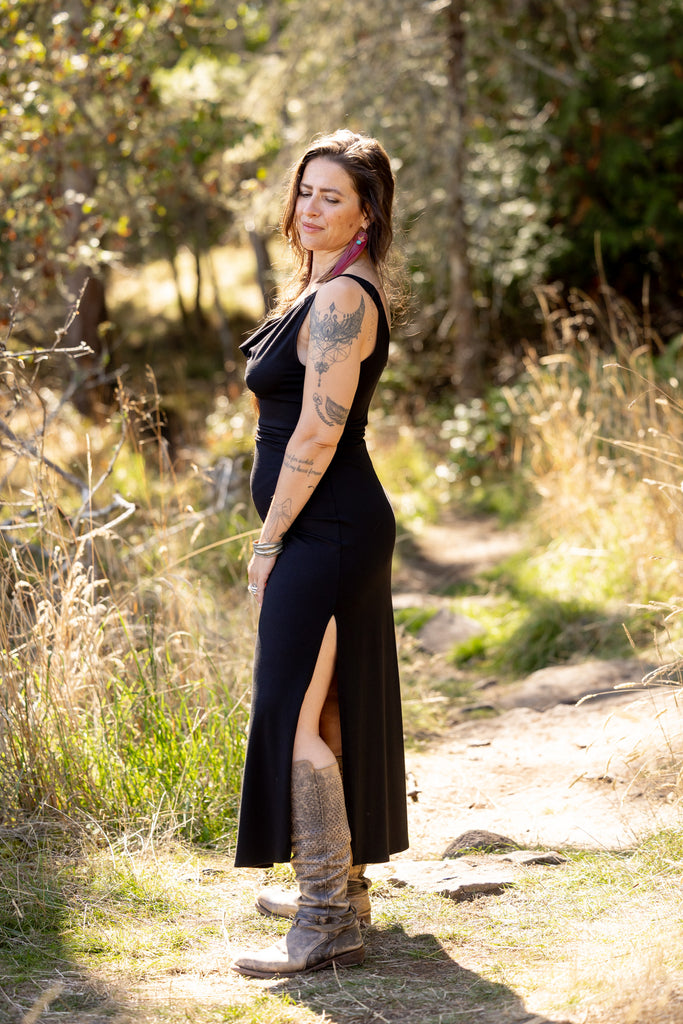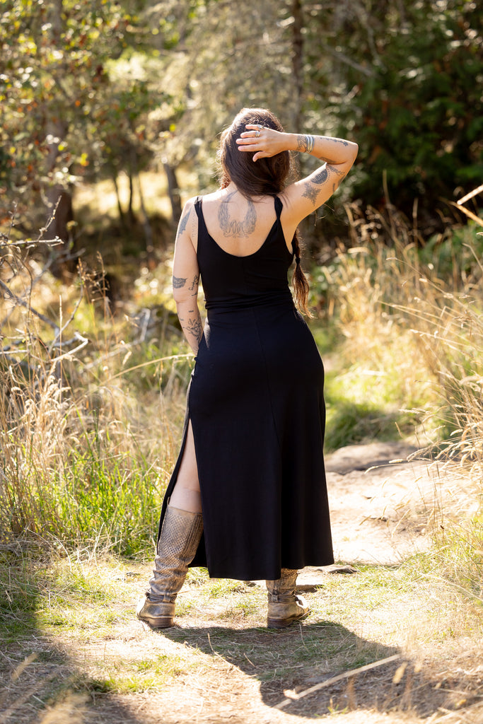 A gorgeous and elegant classic dress. Designed to be slim fit and full length. This piece is so versatile. Looks great on its own, with a belt or paired with tights. The slit is just high enough but not too high.