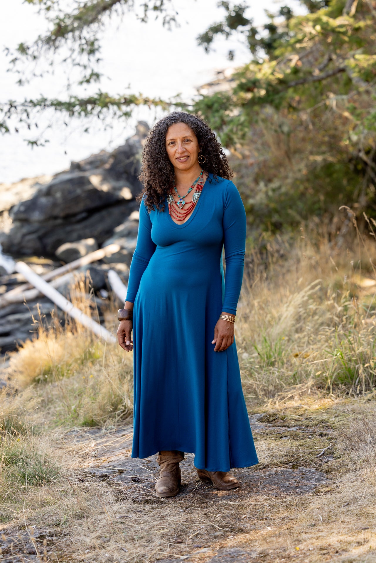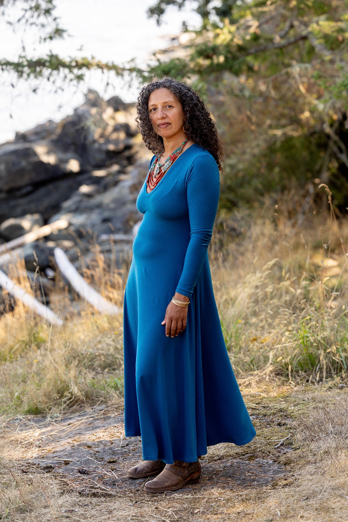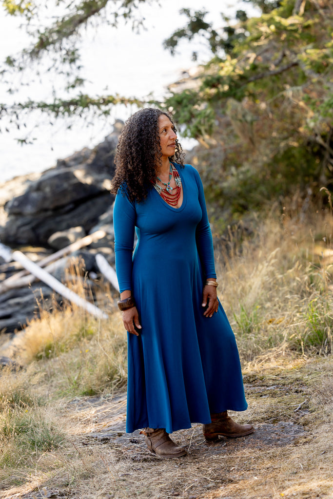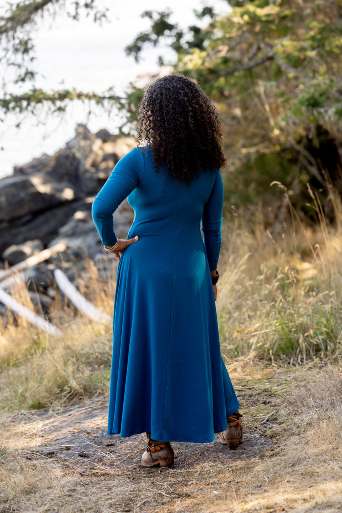 A stunning full length dress. The neck is a low v-neck shape. Full length. Simply gorgeous. Tighter on top with full flow on the bottom.