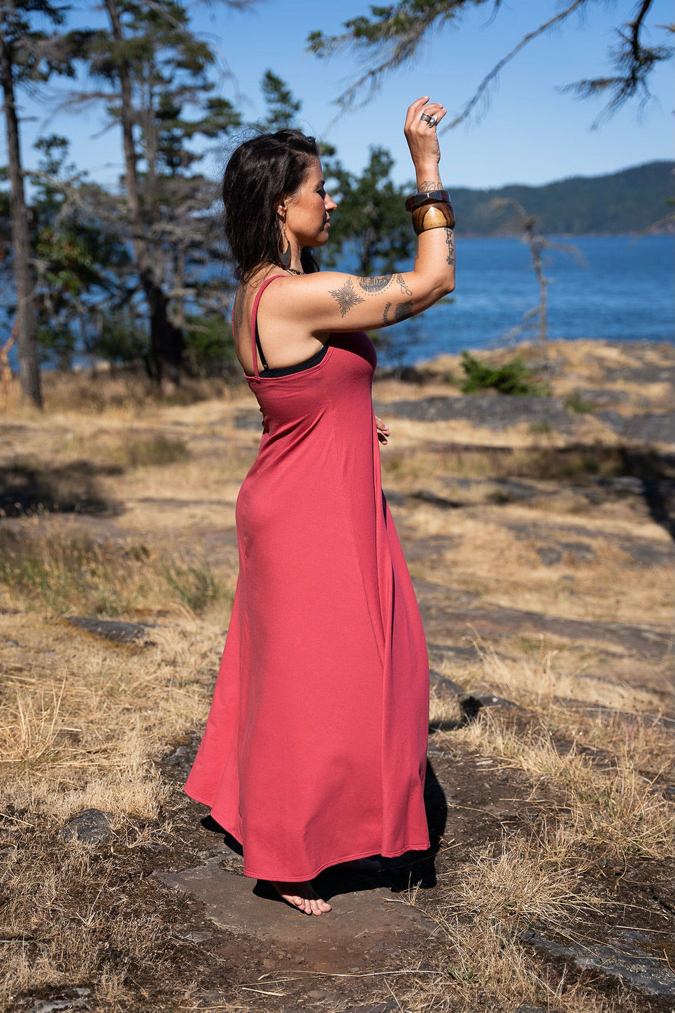 A gorgeous dress with a full flowing skirt. This piece is so flattering on so many women! Fitted at the top with the perfect flow from your bust to the bottom. It does not touch the ground as some maxi dresses do!